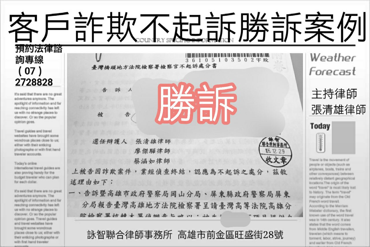 高雄律師張清雄(07)2828828-客戶詐欺不起訴勝訴案例