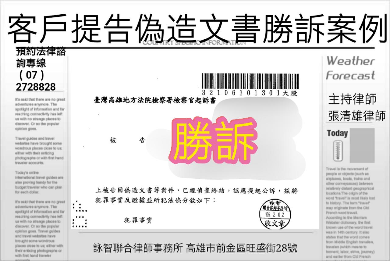 高雄律師張清雄(07)2728828-客戶提告偽造文書勝訴案例