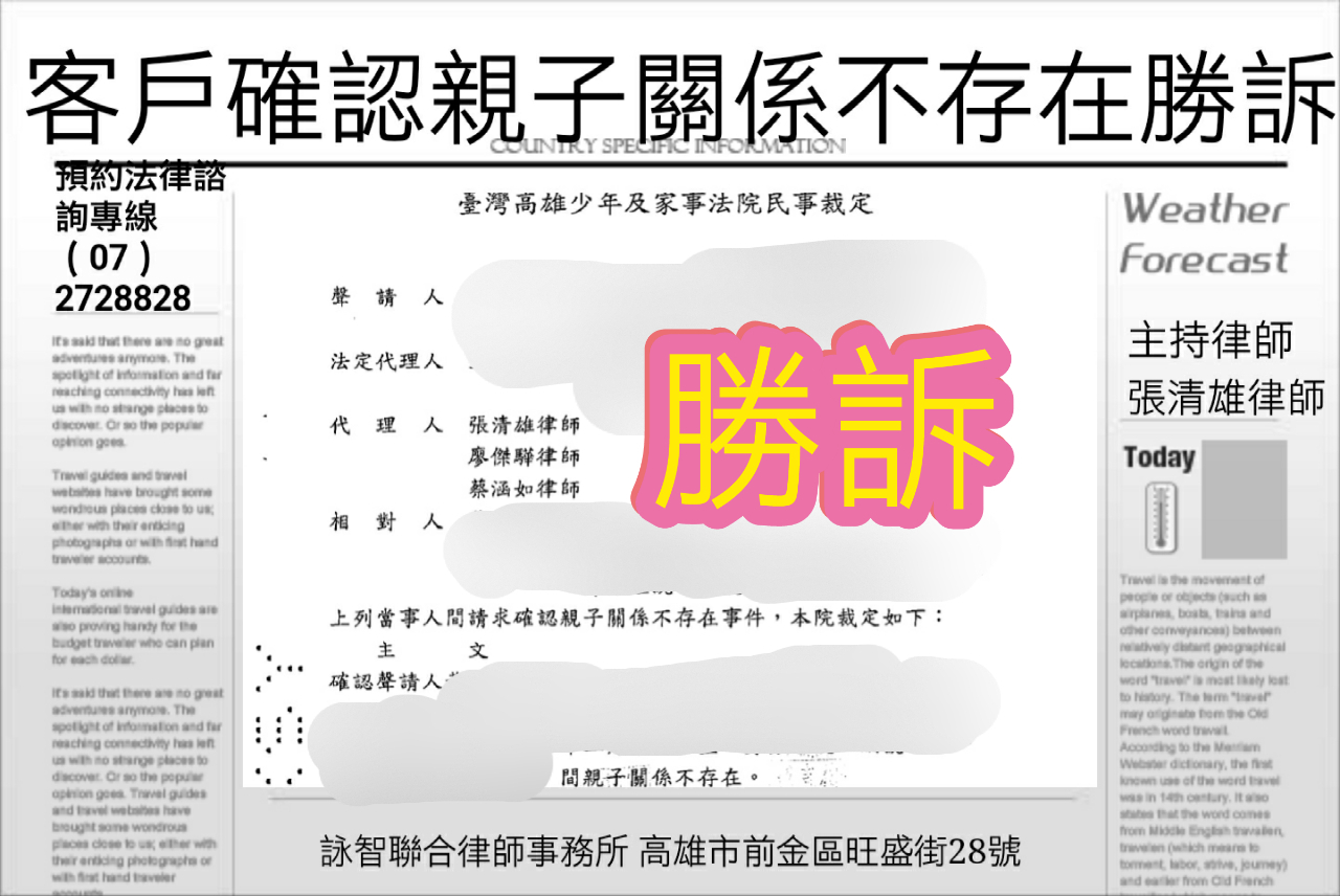 高雄律師張清雄(07)2728828-客戶確認親子關係不存在勝訴案例