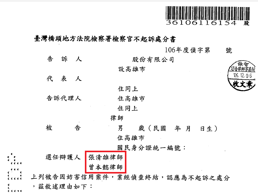高雄律師推薦張清雄(07)2728828-客戶妨害信用不起訴勝訴案例