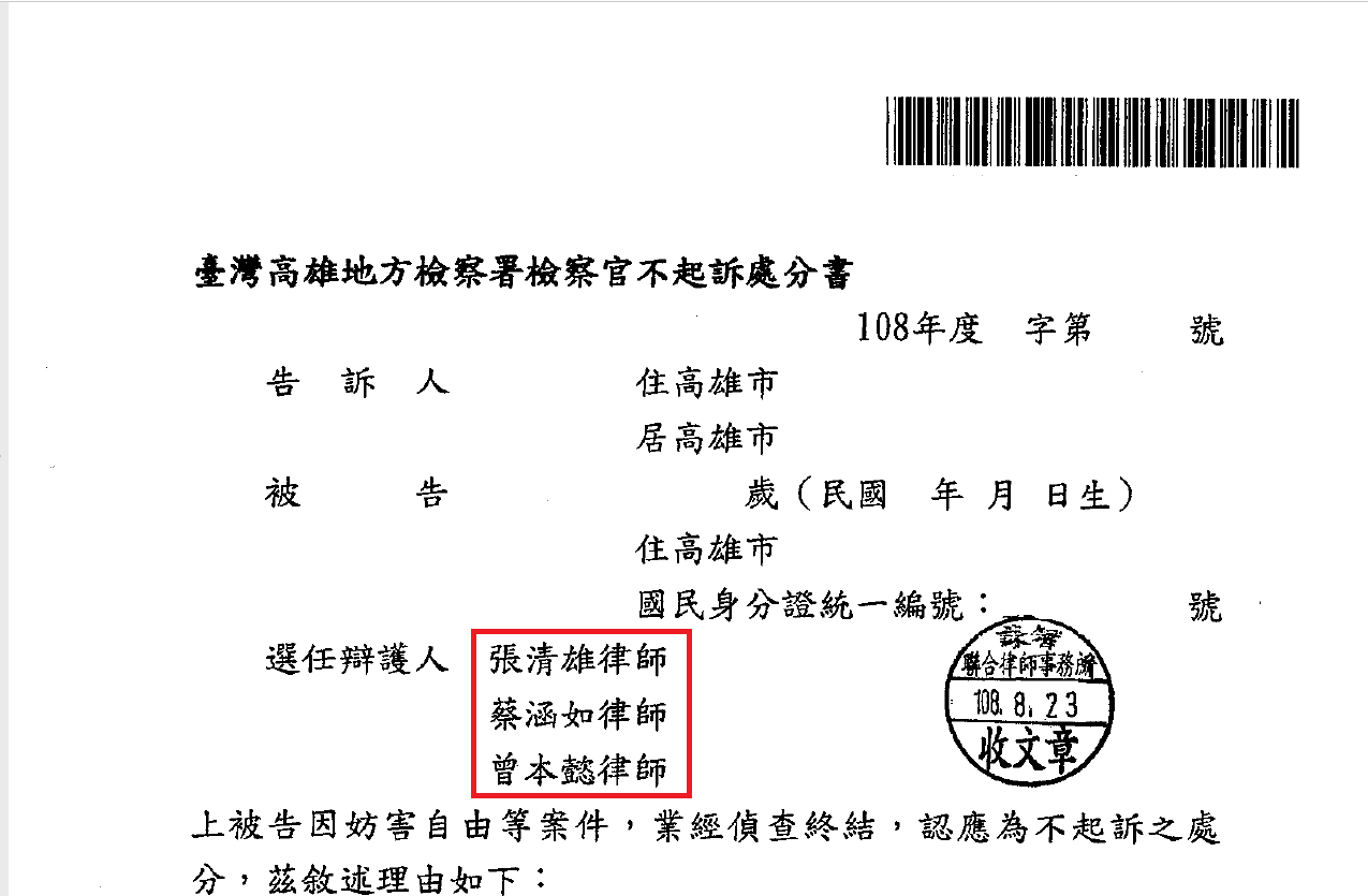 高雄律師推薦張清雄-客戶妨害自由案件不起訴勝訴案例