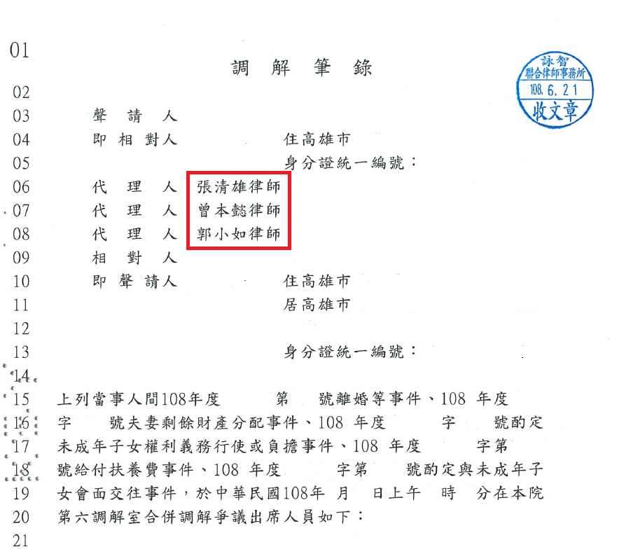 高雄律師推薦張清雄-客戶離婚等事件調解成功案例