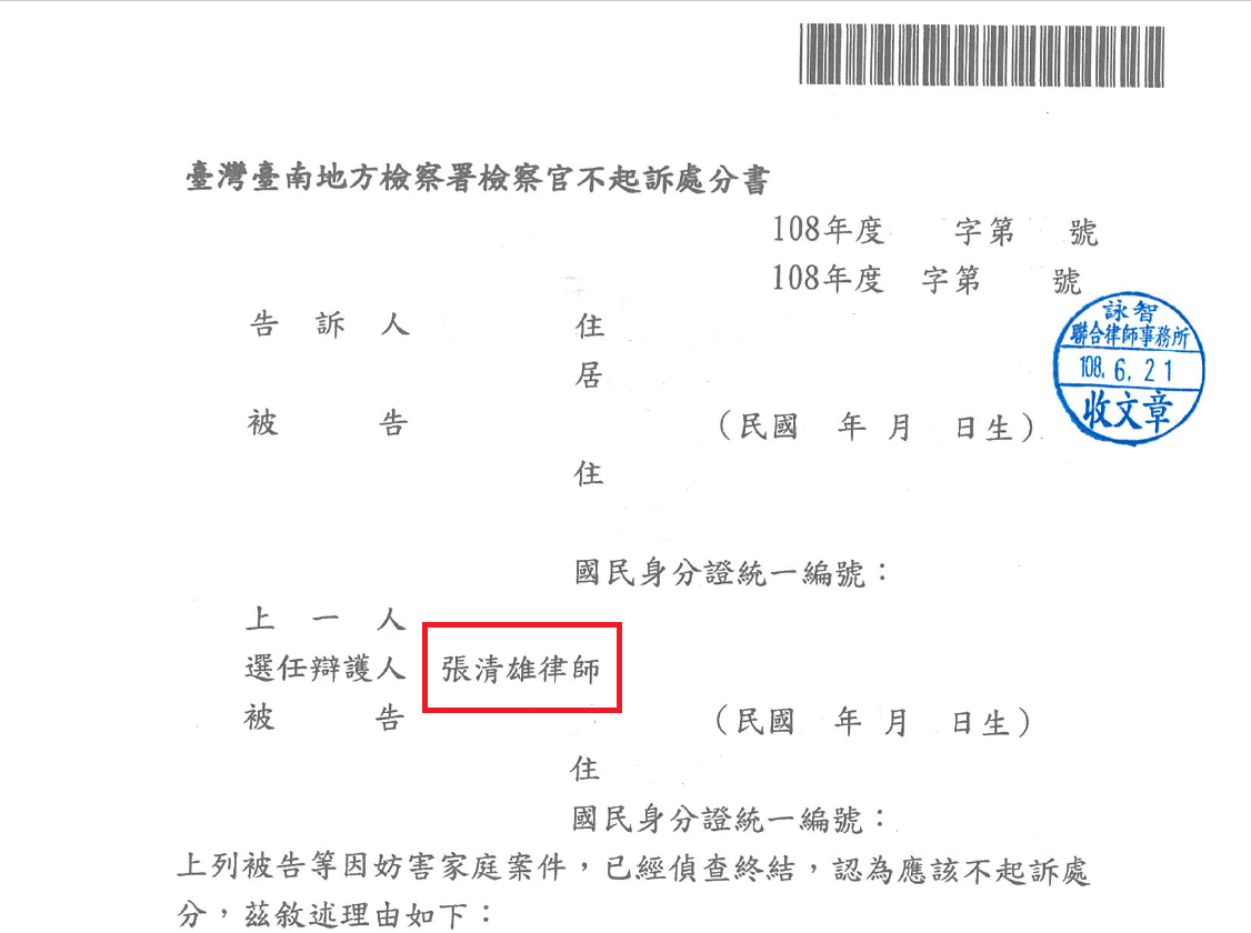 高雄律師推薦張清雄-客戶妨害家庭案件不起訴案例